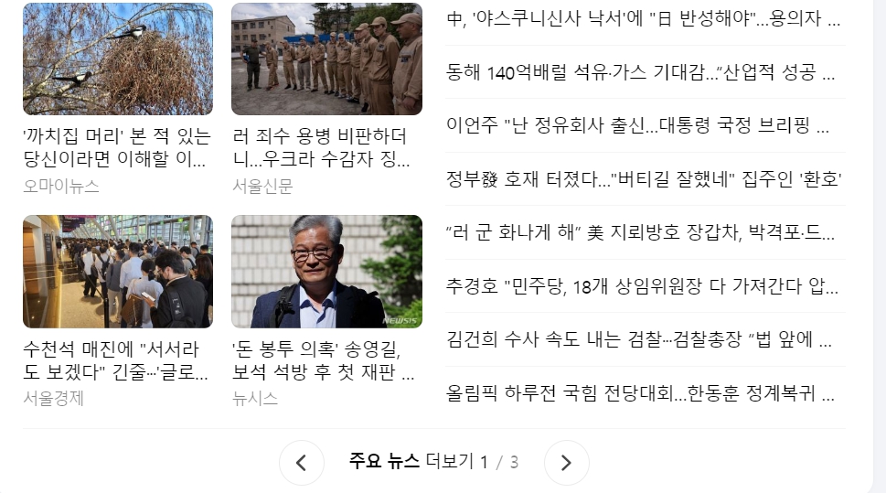 다음 뉴스: 국내외 다양한 뉴스를 실시간으로 제공하며, 정치, 경제, 사회, 스포츠 등 여러 분야의 최신 소식을 접할 수 있습니다. 또한, 각종 칼럼과 오피니언을 통해 깊이 있는 정보를 제공합니다.